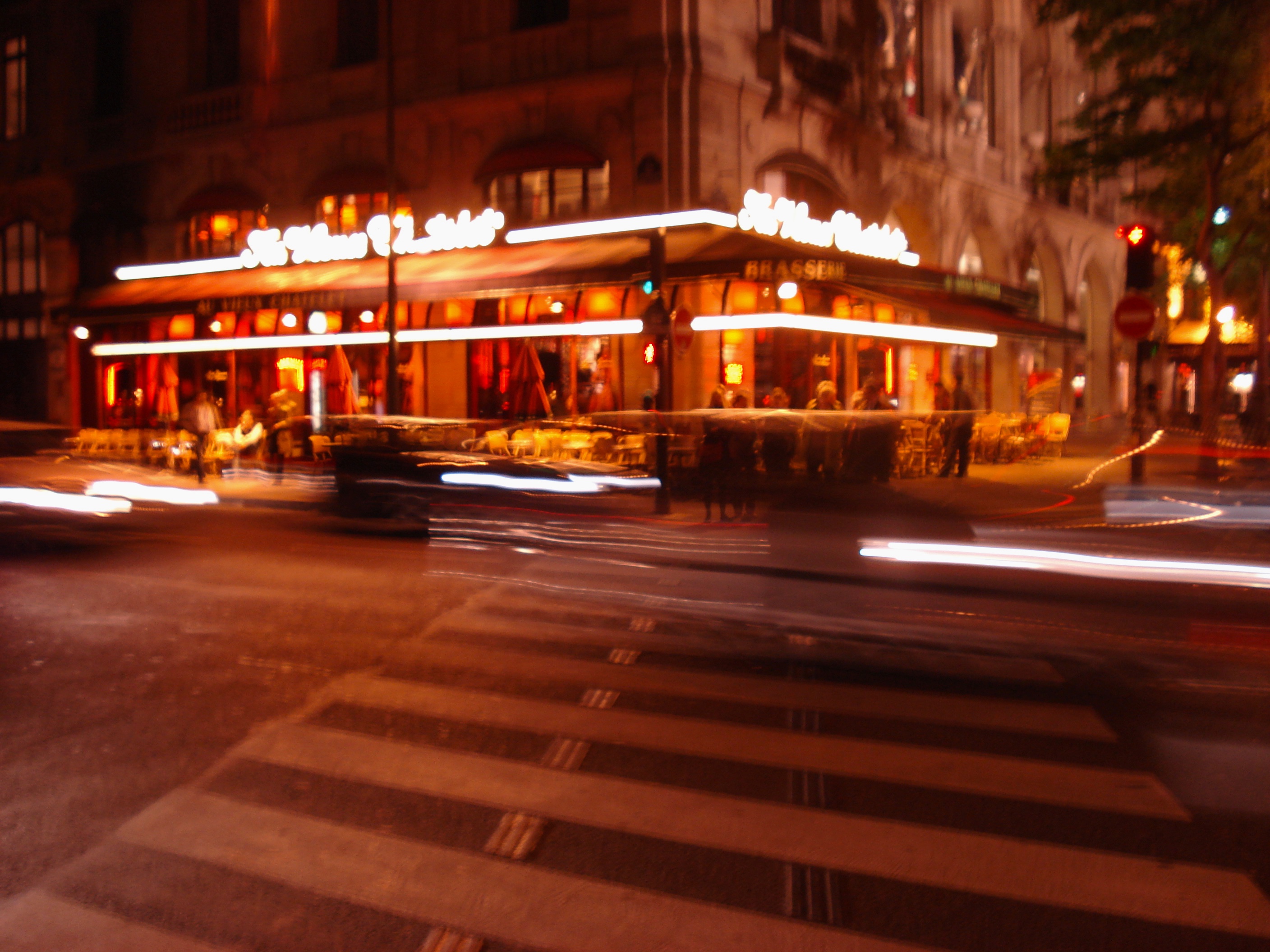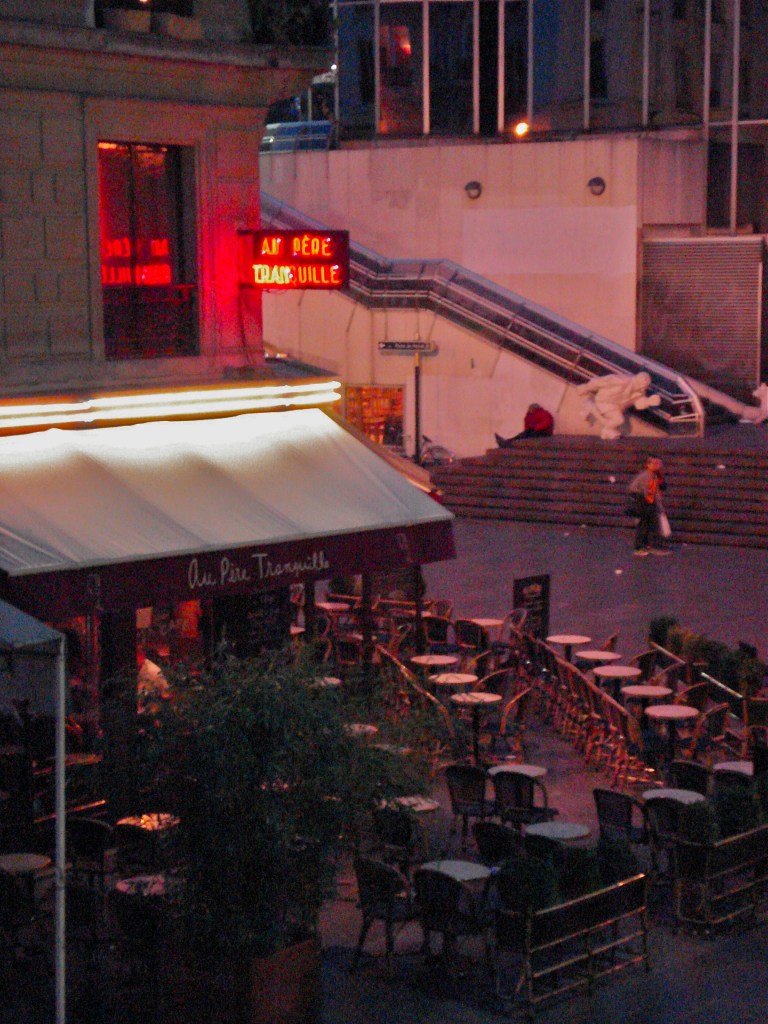 It is night time at Rue Rambuteau. Almost eleven thirty at night (Sunday night). I’m sitting outside Café Au Pere Tranquille once again. It’s a beautiful night (has been such a beautiful day). The drizzle that fell for most of today has left for now but the pavestones outside the Forum des Halles still shine with the wet. The red neon sign of the Cafe Au Pere Tranquille reflects on the floor with a few remaining puddles there. The coolness of tonight’s air is kind, perfumed by the sweet smell of pipe tobacco, smoked from a table nearby. Each table is candlelit with a small, fat nightlight candle, sheltered from the evening chill within a glass lamp.