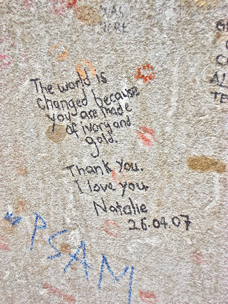 Midday. Sunday. The rain had stopped. I walked for an hour or so through the Cemetiere du Pere Lachaise. I travelled here by Metro (it didn’t take long). The first thing that strikes you is the sound of serenity; an echo of peace moved in the feint wind, lifting up all rolling leaves and shaking out the last drops of the morning rain clinging on to tree branches. Birds were singing. There was a funeral happening today at the Crematorium. Up ahead of me, as I entered, I saw lots of mourners in black gathered there, a hearse sat outside, full of flowers. As always, Pere Lachaise was busy with tourists. They come to see those who have been buried here alongside other Parisiens: Frederik Chopin, Marcel Proust, Carmen’s Bizet, Edith Piaf, Gertrude Stein and Jim Morrison of The Doors. Coming here can make you aware of the influence the arts play in the lives of those treasure them; of those who love the creative spirit in all its expressive fonts. The ability to feel and touch the humanity of living in this moment now, and to fashion it in a language or form that transcends so much limitation. The tomb of Oscar Wilde exudes a pink hue – an angel in statue covered in endless lipstick kisses and graffiti from admirers. So many write words there. One from Natalie quoted from the author’s own work; in ink written on his stone, “The world is changed because you are made of ivory and gold. Thank you.” Further along, on the simple tomb of Amedeo Modigliani someone had left flowers for the Italian artist. Someone, whoever, had come along much earlier and left a long, stemmed red carnation and a handwritten poem on his stone. The carnation had caught droplets of rain, which sat in the petals of burgundy quite still and round. The poem’s blue ink had long run free in the morning’s rain. The words had blurred but the poem remained.