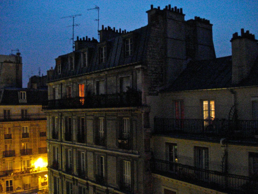 It is late. Cold air touches my face; drinking wine here has left my cheeks feeling flushed. Time for me to head back to my room, soon. Above me, the thick velvet violet of the night sky – illuminated by the surrounding streets here. Some buildings even have rooftop gardens closer than us to there. One star shines brighter than all the others. It shines so high and bright above this part of town. Wish I had a camera now. Wish I could capture this moment forever; I really do not want to go to sleep tonight. I really do not want this day to end. I love being here so much. Looking at that star I have just one wish tonight – just the one ask. And I make the wish. I wished upon that star. And as I begin to move away from my table, a small white dog, with a black sock in its mouth, trots out of the darkness, past the café, and heads down towards the Siene.