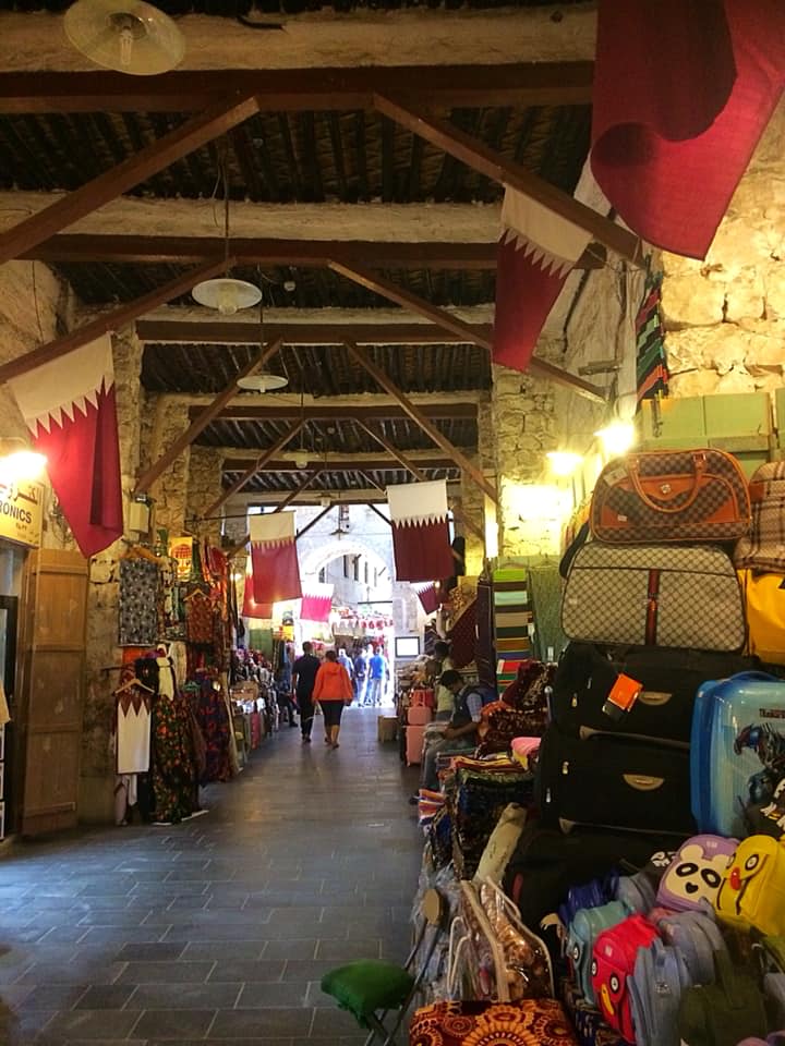 Outside the Museum, I walked along the waterfront. There were lots of boats at the Dhow Harbour empty and floating on the water’s surface. As a tourist, voices called out to me in every language to take a trip. It looked fun – something that should be done – but maybe next time. It was getting noticeably warmer. I kept walking along the Al Corniche towards the souk (following the directions written on my map). The conical swirl of a mosque was my landmark to aim for. Through a jumble of traffic lights I eventually found an entrance into Souq Waqif. Walkways were wide, clean and easy to navigate. Colourful bunting hung and fluttered in the maroon and white national colours; portraits and photos of the Emir were visible, too. Most shops had stock stacked outside on display: shops selling lanterns, lampshades, clothes, bags – giving away welcoming smiles and salam mualikum. Everyone I encountered had been kind, attentive and gentle in manner.