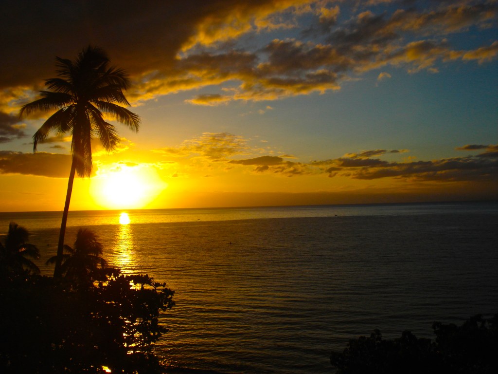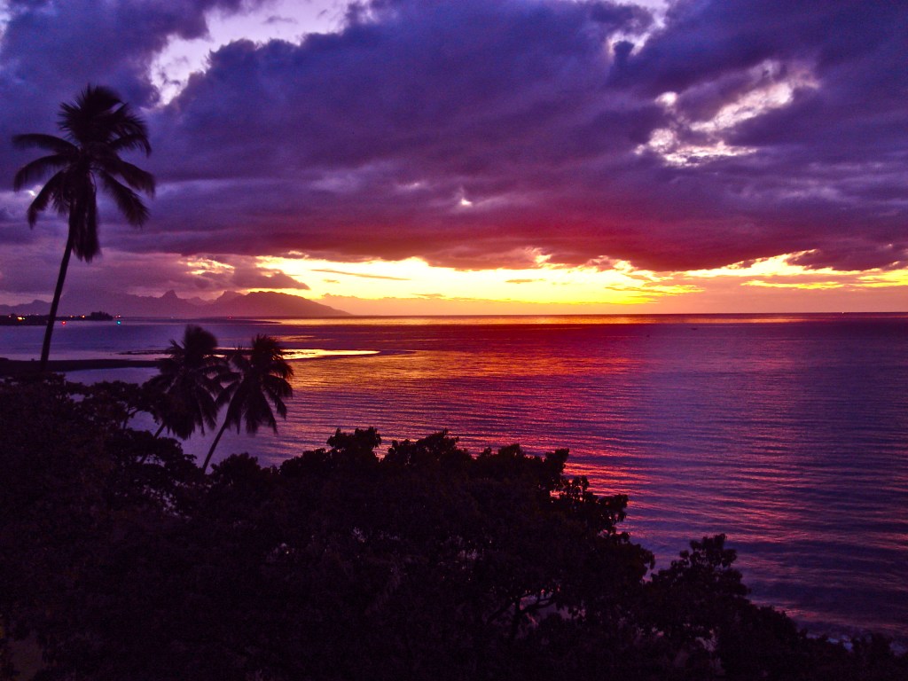Breathless. Still. Tahitian sunset. My eyes are staring into yellow colours on Lafayette Beach. Yellow sun, yellow sky. Some parts should be amber or orange, but the colours are lighter than any sunset I’ve seen before – spectrums of brilliant yellow, gold, sunlight shining through champagne. It is late afternoon. Endless flat ocean, stretching far forever into these Pacific skies. Waves are crashing ashore. White foam churns on black sand, turning pink in this equatorial light releasing a burst of rainbows in the spray thrown onto the shore. Pebbles rattle as the retreating tide inhales another breath before the next crash. Some children play in the surf beyond the breakers. A fisherman loads up his bait on the reef to my left and casts out into the water. The sun has lost its glare, heat and sting for the day; its warmth is across my skin. The ocean continues to crash along the shoreline and the sand is constantly changing colour. It seems to flicker with flecks of gold within its black, volcanic ash. It is fine like a powder; when wet it shimmers like silk. As the ebbing waters recede pack into the Pacific the wet, black shoreline seems to shine a dark blue, leaving it coated there. It is extraordinary. The whole beach is an alchemy of colour. Even now, looking at the ocean, some parts of it seem to be green (a dark emerald), with half of it blue, with bands of gold and turquoise near the reef. The colours are constantly changing. Some parts blue, some lighter, some bits black, some bits of bottle-green, the patches of pink still swirl in the surf (in the shallows). The sun is setting so quickly. I had heard about the way the sun drops quicker at the equator at a day’s end; it is racing down quicker than the colours of sunset can follow. I watch the yellow disc meet the edge of the horizon. Some French teenagers sit further up on the sand behind me, one has a guitar and all begin to sing Bob Dylan’s ‘Knocking on Heaven’s Door.’ Their singing fills the air. The ocean keeps changing colour. The waves of the Pacific Ocean keep coming ashore.