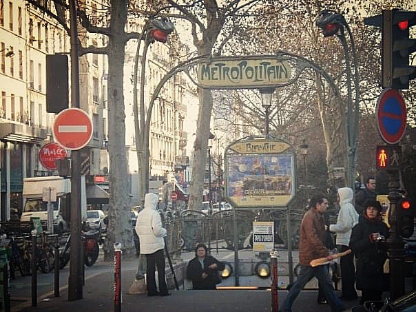 People are walking, busy, going places. Christmas will be here within the week. Everywhere you look on this Saturday morning, people wear scarves. Woollen hats cover heads. Hands are in gloves, or in pockets. Pockets of hot air fur and curl in tumbling clouds above the Metro air-vents, rising up from underground alive with the sound of rumbling carriages approaching the Place de Clichy station. People are waiting to cross the road. An elderly couple stand patiently holding hands, clutching bags of shopping; one is dressed in a coat of brown leather, the other in a coat of tan suede. The trees above them are bare; there is no green left on any of the branches. A woman sits on the steps of a statue (she was there yesterday). All she has is a sign that reads ‘Aidez-moi’ (help me). All I had was an orange. She gave a blessing in exchange. Traffic slows down to a standstill. Lights change colour. People cross the road. A blackbird flies up towards the frozen sun.