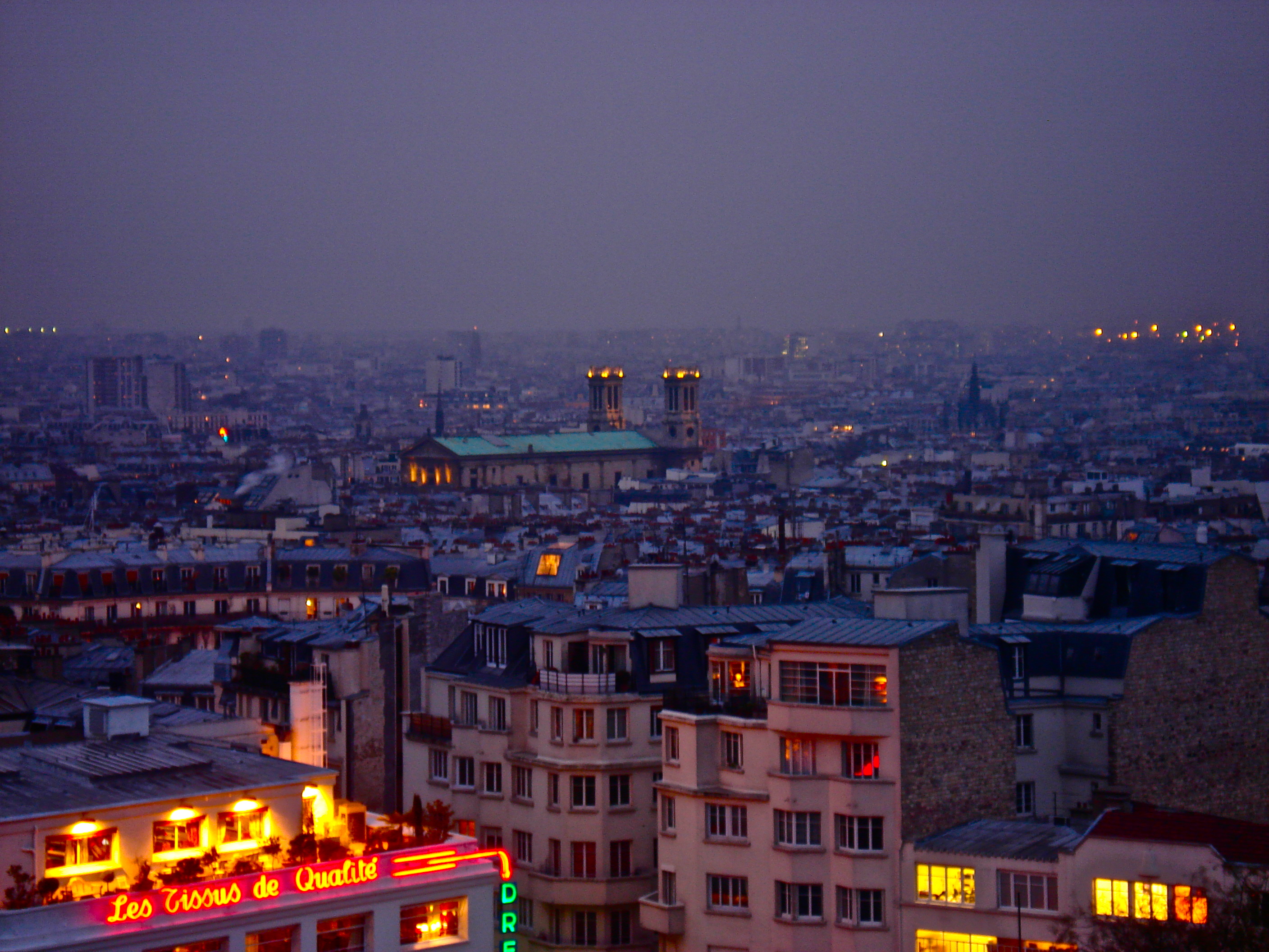 The day unravelled as the sun struggled to climb above the rooftops. I followed Rue Caulaincourt as it curled around the sloping sides of Montmartre, leading up to its summit. The street was longer that I had anticipated, and the laboured climb felt much steeper in the cold. Somewhere near the Moulin de la Galette I saw a street vendor in a small, mobile booth selling hot crêpes. I ordered and watched him pour a mixture of batter across a hot, flat iron. Steam rose. The griddle was circular and he used some kind of spatula smooth the batter, to make it round, so it cooked evenly. Then it was turned over and just before the cooked side began to smoke he added a broad stroke of nutella and a spoonful of chopped almonds, folding the snack up into quarters. The crêpe was hot in my hands and the chocolate melted as I ate it. Within a few minutes of walking the Sacré Coeur came into view (the basilica’s distinctive curved, white dome peered above the rooftops and floated up into the sunlight). Despite the cold there were lots of people milling about outside – tourists, priests, nuns, locals – pushing in together through a doorway to shuffle into the candlelit warmth of the church. Outside were numerous spaces to sit or stand and look out across the city. I sat on some steps to finish eating my crêpe. It was a wonderful view, facing out over a frozen Paris. The difference in height gave the appearance that the entire city was hibernating in a valley frozen in sub-zero shadows. Fog hung along the horizon. Steam and smoke rose from occasional chimneys. Coloured lights lit up pockets of freezing gloom. December sunlight only managed to touch the green roof and twin spires of Notre Dame and illuminate the Grand Palais and Eiffel Tower. Paris stretches out so far and wide from this vista.
