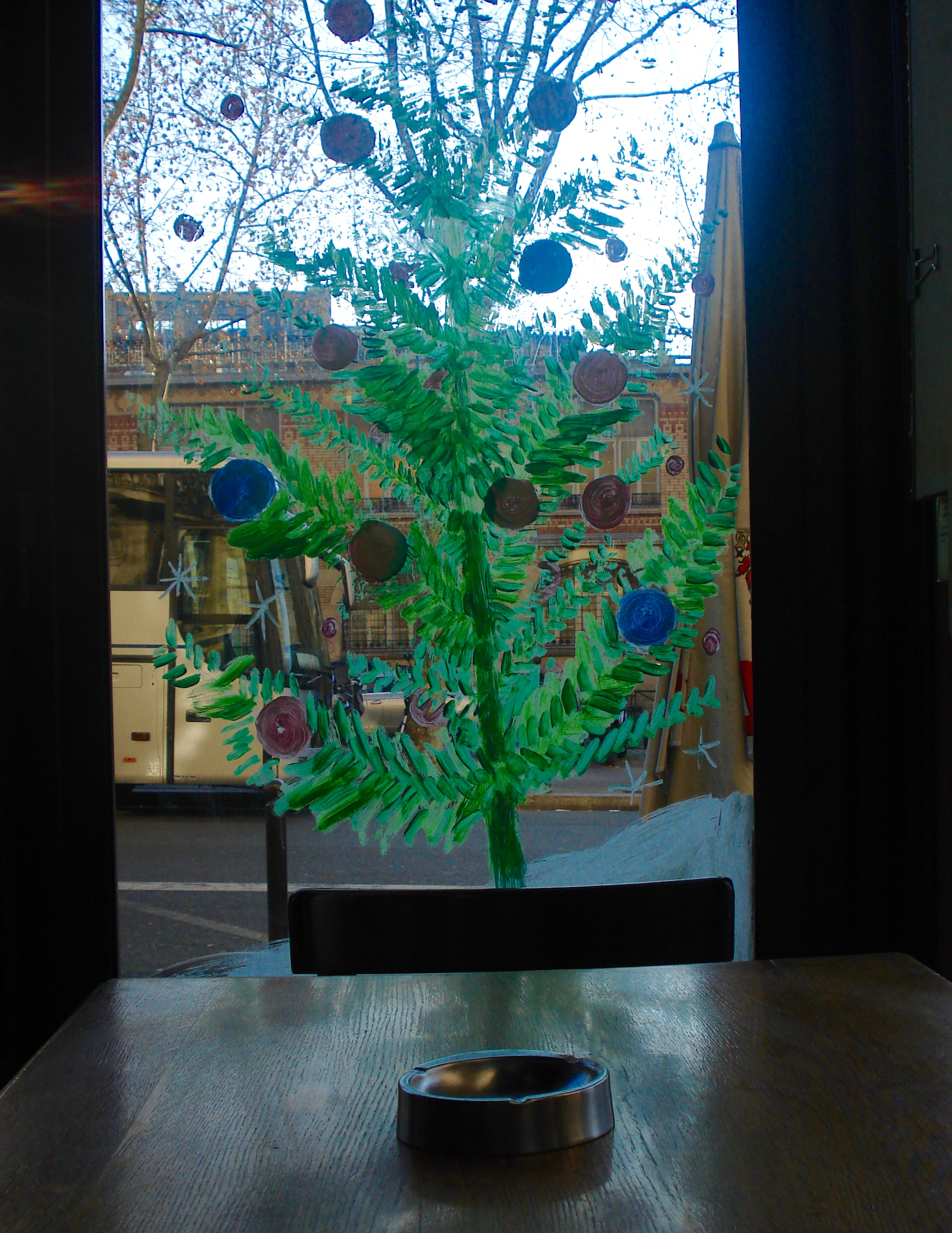 The light from the Eiffel Tower spins around in the darkness, dancing across the rooftops of Paris and out into the endless reaches of the frosted night sky. Passing by Le Carolus – a bar on Boulevard de Clichy – I enter and sit at the long bar (marble topped, polished and clean with a curling brass bar-rail running all around). Everything is clean and is warm. Colours dance and blend in the tinsel and candlelight. Rugby is shown muted on a large TV screen (a match between Montpellier and Petrarca). Music sounds from a radio behind the bar. It plays a song called ‘Falling’ by Julee Cruise. Somehow the song feels right, fits the evening. People are relaxed and talking, the guy next to me is reading a newspaper, the kitchen sizzles within the stove of an orange glow. Busy hands are working: polishing glasses, delivering food, cleaning cutlery. A waitress walks out from the kitchen feigning injury in an act of theatre to melt the heart of the owner (a big, bearded man who stands behind the bar with his arms folded). He watches her approach. A small game of affection breaks out. She tells him she has been burnt, and holds her hand out to show him. His eyes drop down to the hand. He looks unimpressed. She says something and playfully flutters her eyelashes. His arms remain folded. The pair lock eye contact – her smiling, him impassive. Time stands still. A customer sneezes. Then the big man, the owner, cracks his poker-face façade and breaks out into a loud laugh through his black beard – he grabs both her cheeks and plants a kiss on her lips, she wraps her arms around his wide midriff and the pair hold an embrace. She walks off into the service area smiling, her ‘injured’ hand swinging at her side. He watches her walk off, smiles, and lights up a cigarette.