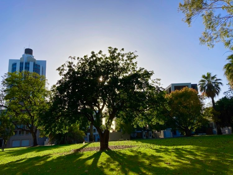 From where I stood it was easy to pinpoint exactly where the sun would appear. Most of the horizon was tainted orange with some overnight clouds clinging to the sky; the ridge of sharp edged buildings between the river and the city were silhouettes of varying heights (some reflected light and blurred images). As the morning breeze blew leaves moved all around me. There was traffic moving on the freeways that drove into, along and past the city centre itself. A train – maybe the first one of the day – climbed over the Narrows Bridge, rising up then gliding down into the maze of track leading towards Elizabeth Quay. And in front of this view an old man in a blue shirt and trousers walked his dog, yanking it back onto a path as it stopped to sniff and search inside one of the bushes adjacent there.