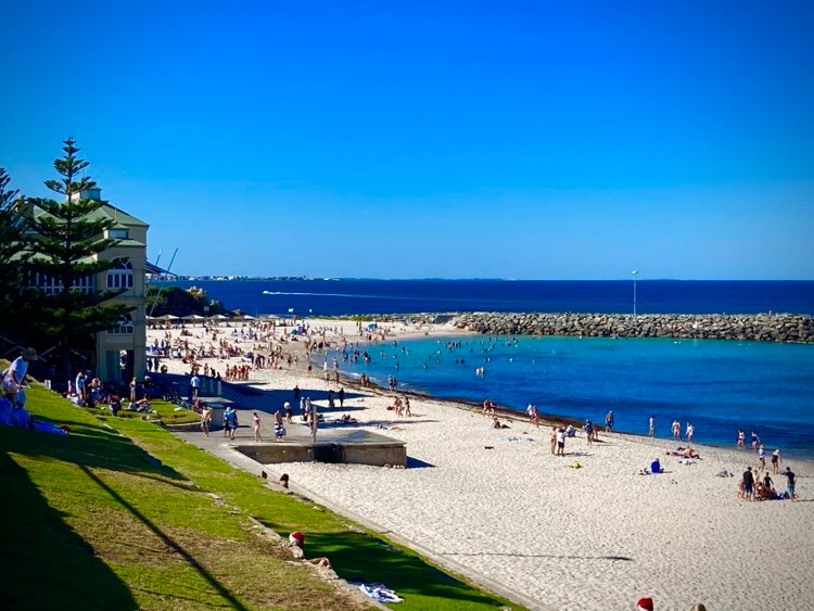 Despite arriving early – early enough that the sun shone behind the Indiana Tea House casting a giant shadow across the sand making it cool – the beach was busy. The sand had been pockmarked with small dunes of footprints – made worse with a small, black dog chasing seagulls that tried to stand there. People in groups, of friends and families, sat together facing the ocean. People were happy. Some drank fruit juice, or poured glasses of champagne, others shared food. There had been an old man, up near the rocks, who had sat alone in a chair, wearing a hat, reading a book; I remembered him because his chair had been positioned so close to the water’s edge that the legs of the chair had sunk deep into the wet sand and the occasional waves that washed over his feet made his toes dance. That day the ocean had been flat – flat from shore to horizon. There had been a swimmer just beyond the reef splashing in strokes between the patches of blue and aqua green. As ever, the shape of Rottnest Island was fixed straight ahead. A large tanker sat further out. No matter how many times you swam in the Indian Ocean blue it always left you feeling so alive and content. Floating in the shallows I looked back at the beach and saw all the people celebrating Christmas together on the sand.