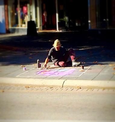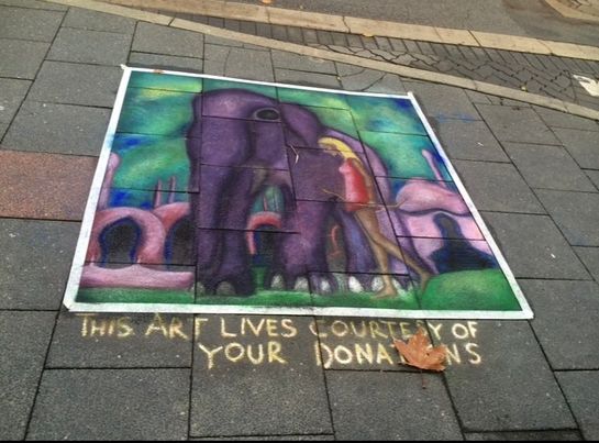 At the corner of the next intersection a street artist was painting a large purple elephant in chalk on the floor.