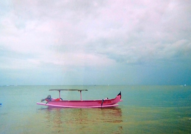 Further along the beach, the Lupa floats about without care on the flat silver ocean. It is visible from a distance, being a distinctive bright pink. Lupa is a boat – a jukung – a long, hollowed wooden outrigger with long, lateral supports. It is anchored in waist-deep water and having spun and drifted all day it now bobs and nods on the easy sea. Clouds move east filling the Balinese sky with moisture and heat. Captain Nyoman stands looking out to sea. No tourists. No good. No money. Arms folded over his chest he walks along the water’s edge. He sees something, bends down to pick it up. He looks at it in his hand, then tosses it out for the ocean to keep.