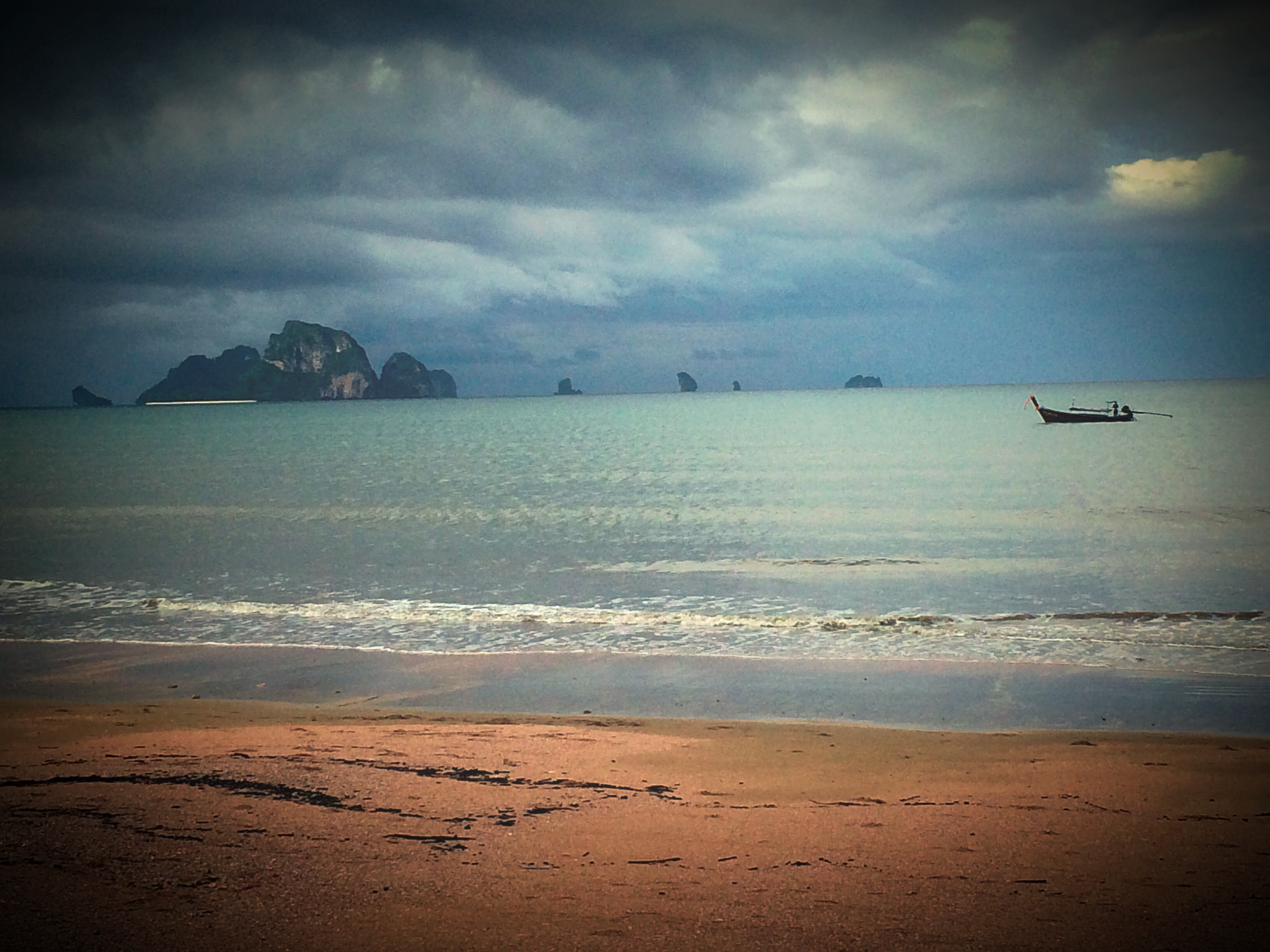Waves were rolling ashore from the ocean. The sky was still overcast with clouds making the colours of the ocean jade in colour. At the end of the beach, the ridge of limestone rocks remained standing in the waters of the Andaman Sea. Longtail boats continued to streak across the ocean moving towards Railay Beach and AoNam Mao Pier. Chunks of cumulus cloud drifted along the horizon. Raindrops hung from branches like jewels.
