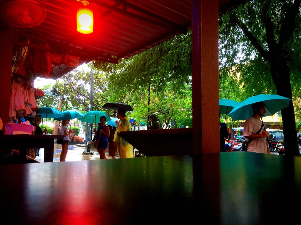 Towards the far end of AoNang beach – near the little shrine at the foot of the Monkey Trail – there were yoga classes held each day at sunrise and sunset. Having booked in for a morning class, I had arrived early and so waited near where I had seen the class advertised. I leant against a small wall facing the beach. While it had been raining when I first woke, the morning was overcast with rolling clouds, grey and thick, curdling low above the ocean. This was low season – or rainy season – when downpours and electrical storms were more frequent. Despite this, it remained warm and humid. Many relaxing afternoons had been spent under cover watching the rain and listening to it fall in AoNang.