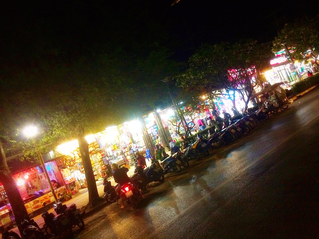 A gust of wind made the wooden wind chimes hanging behind me rattle and echo. They belonged to the restaurant whose wall I was leaning up against: Plaifa. Its signs and menus sleep stacked up on the empty counter and closed kitchen (they opened for breakfast later in the morning). Plaifa had lots of aloe vera growing in short, fat pots outside an area between its service area and the next restaurant. Birds the size of matchboxes chirped and hopped about the pockmarked sand and fallen frangipani flowers there. Light struggled through the flat, broad leaves of the trees surrounding the restaurant. Dappled patches of shade moved on the ground as the wind blew in off the ocean. The scent of jasmine incense being burnt was present in the air for a brevity in time before the humidity and rolling waves overtook the senses.