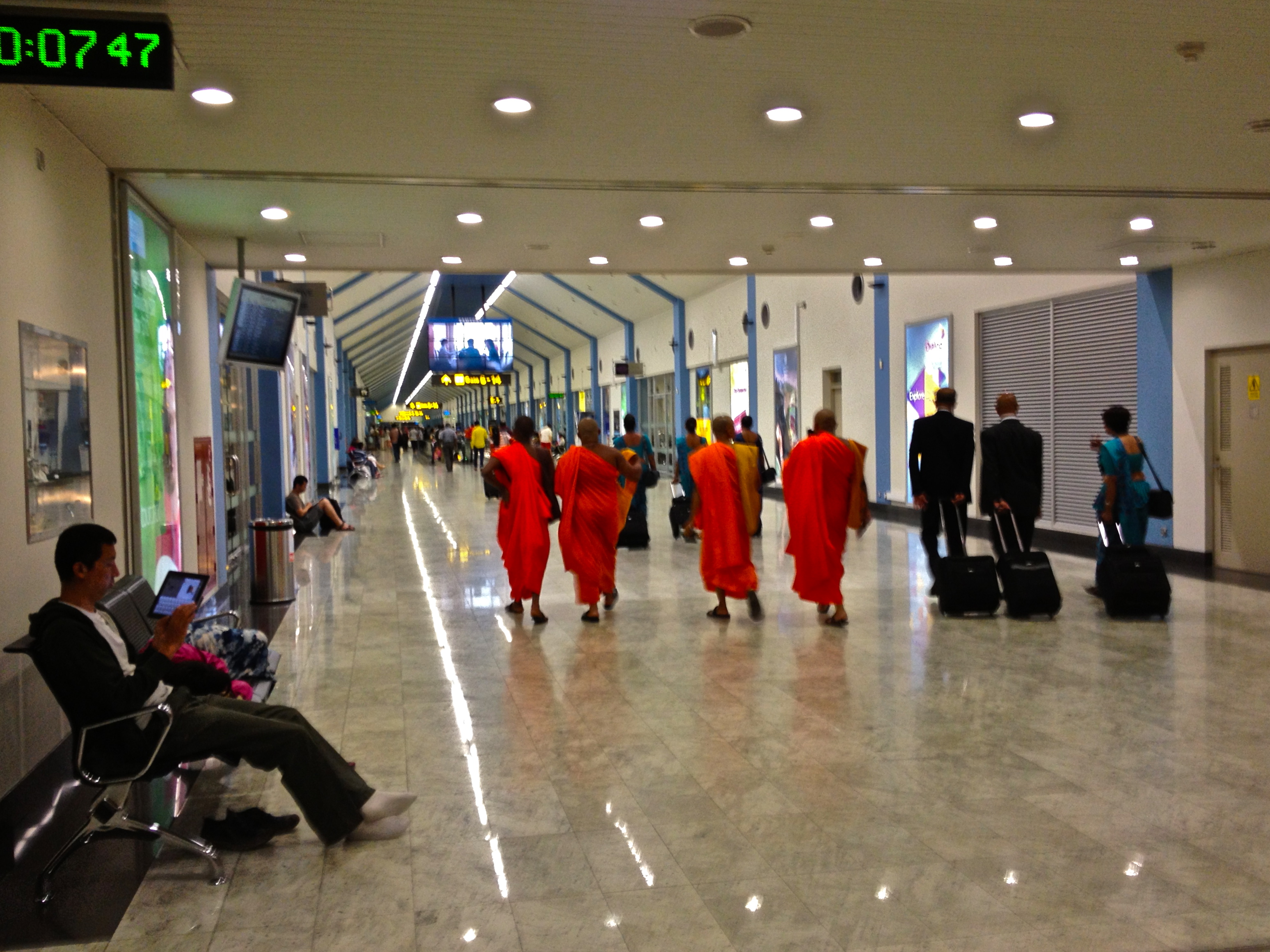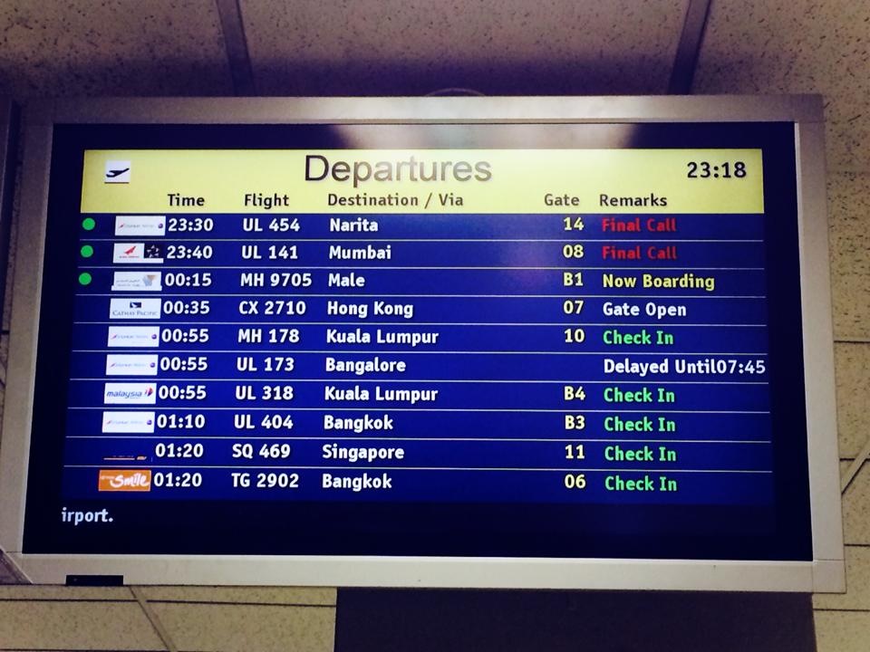 And so at 10.30pm I waited in my room. I was waiting for reception to call and to tell me my taxi had arrived to take me to the airport. Last minute brinkmanship; I could wait. Maybe the taxi was running late (stuck in traffic). There was no real urgency, after all, it was only a five minute drive. Maybe I had to ring to confirm first. At 10.45pm I gathered up my belongings and made my way down to the lobby. Maybe the driver was waiting there. It was empty. It was dark. It was quiet. The Duty Manager at the hotel rang the number I had been given for the taxi. There was no answer. He rang again and left a message on the answer phone. We waited for a short while, talking together, before he offered me a voucher for a complimentary taxi to the airport. It was a gesture much appreciated. I thanked him. Just as he was about to call a local driver, the one I had booked arrived out of the blue. It was now eleven o’clock. It was now time to go. We drove out of Colombo into the darkness, into the ending of another adventure, leaving behind a wonderful afternoon in the night. We drove out into unknown roads and unseen streets, moving, merging, turning, overtaking and arriving at Colombo international airport. This was it, then. The holiday was now over. Back into another airport. I checked in and wandered off towards the security checks. I stared at a flight board, found my flight and made my way to the boarding gate. Everything was on time.