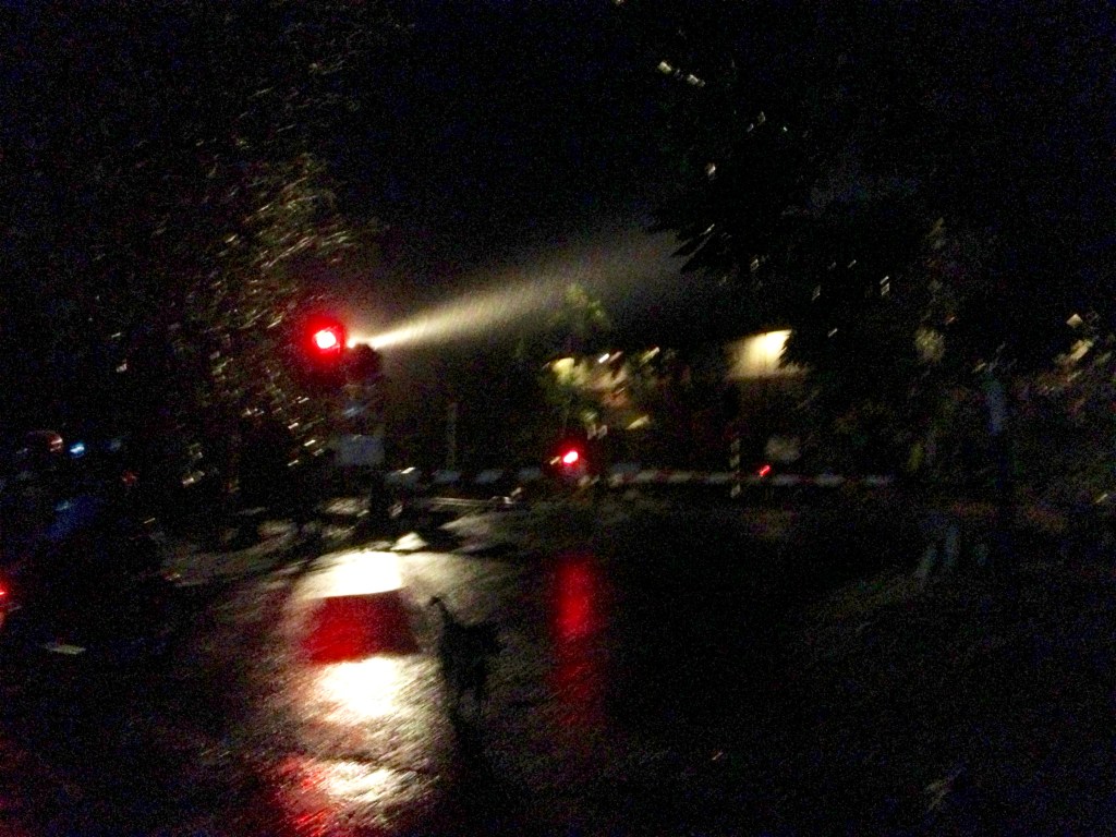 Had I known the way to the temple then I’m sure it may have been within walking distance. But out in the unfamiliar settings it didn’t take long to become disorientated and lose heart in the adventure. Everything had looked so different in the dark. The gardens between my room and the restaurant had become a concussion of towering shapes and labyrinthine shadows. Small yellow lamps, set low in a wall scattered a burr of soft lights – casting circles of silent halos along a stone footpath and its flat-leafed plants. Trees rose up overhead in great sprawls – mostly palm trees fanning their outlines against the night sky. Three giant coconut tree reached up high – so high – mediating the worlds of darkness and downpour. Beyond that, the parameters of the unknown stretched out in all directions.