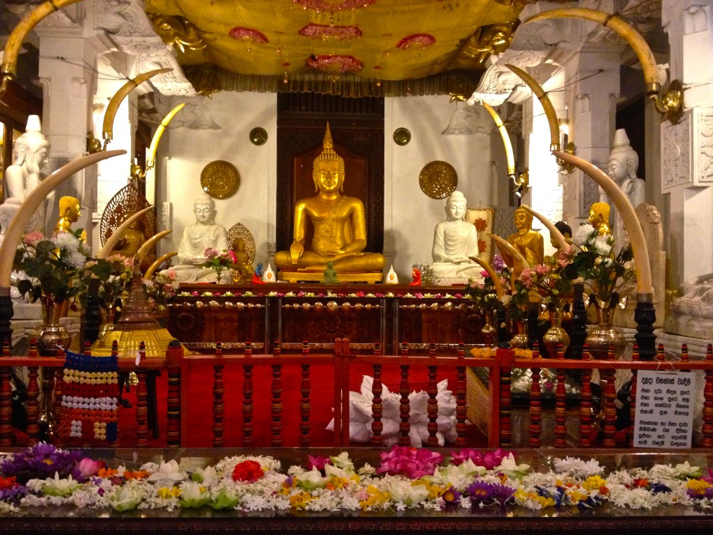INSIDE THE TEMPLE: A guide met us and took us inside the Temple: lots of people outside the temple; shoes off; walked inside – lots more people; colour, carvings, beauty; buildings within buildings; mantras on moonstone; saw the relic of the Buddha (locked in a casket); monks, robes, shrines; garlands of flowers, every colour imaginable, golden buddhas (eyes lowered in meditation). After the tour, we were ushered back into our vehicle for the drive back. Wanted to see more of Kandy. We had to drive back.