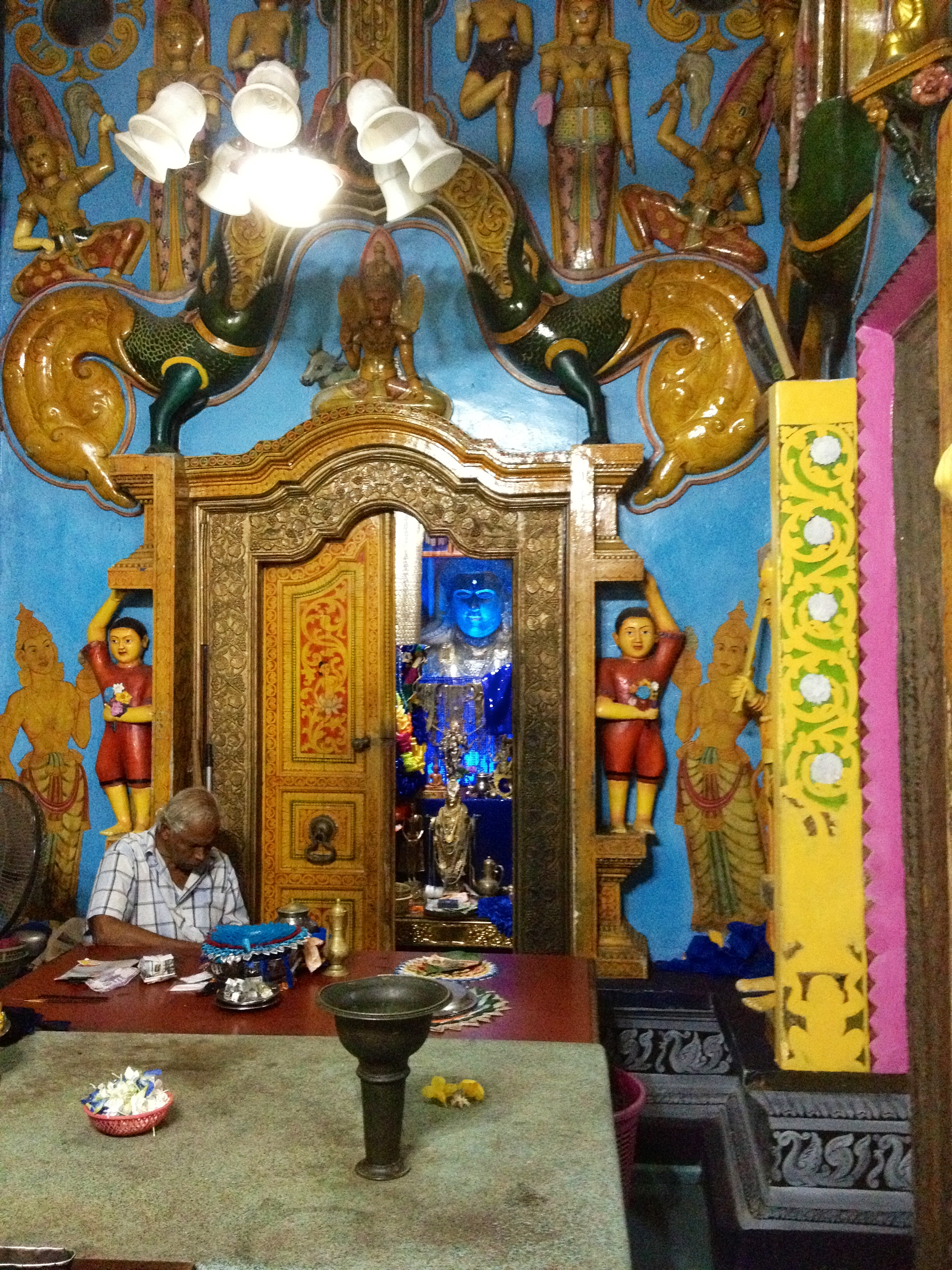 We approached the temple in darkness. A road led upwards towards a large, empty carpark. A giant statue of the Buddha, dimly lit, sat gazing out into the darkness behind us. Petals of the lotus flower surrounded the sculpture. And there I saw moonlight and palm trees moving in shadows. And then I was led inside the temple and saw colours and flowers, painted walls, painted images and symbols, rooms within rooms, doorways leading inwards and along, seated Buddhas, reclining Buddhas, I saw Sinhalese script etched onto painted walls aged and fading in patches, I saw patterned tiles, I saw serenity and beauty abide in this place, I saw a young man alone kneeling in a room without lights holding incense as he prayed, I saw the silhouette of a dharma wheel illuminated by candles against a red silk drape hanging against a wall. I saw an old man at a desk writing in a book and behind him a large wooden panel cut into the wall, with one door ajar and a blue Buddha statue facing outwards.